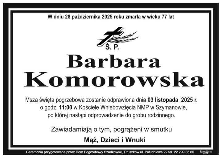 W internecie pojawił się nekrolog Barbary Komorowskiej. Współzałożycielka firmy Bakoma zmarła we wtorek, 28 października. Miała 77 lat. "Pani Barbara była osobą mocno zaangażowaną w nasze lokalne sprawy. Zawsze serdeczna, pomocna, hojna i otwarta na drugiego człowieka. Przez całe swoje życie wnosiła wielki wkład w dzieje i rozwój Gminy Teresin. Była inicjatorką powstania Szkoły Społecznej oraz Społecznego Przedszkola w Teresinie" - czytamy w informacji opublikowanej w czwartek na facebookowym profilu gminy Teresin (woj. mazowieckie).