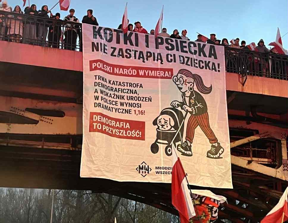 11 listopada ulicami Warszawy przeszedł tradycyjnie Marsz Niepodległości. Uwagę Krzysztofa Bosaka przykuł jeden z transparentów, który zawisł na jednym z mostów. "Kotki i psiecka nie zastąpią ci dziecka. Polski naród wymiera! Trwa katastrofa demograficzna, a wskaźnik urodzeń w Polsce wynosi dramatycznie 1,16. Demografia to przyszłość" - czytamy.