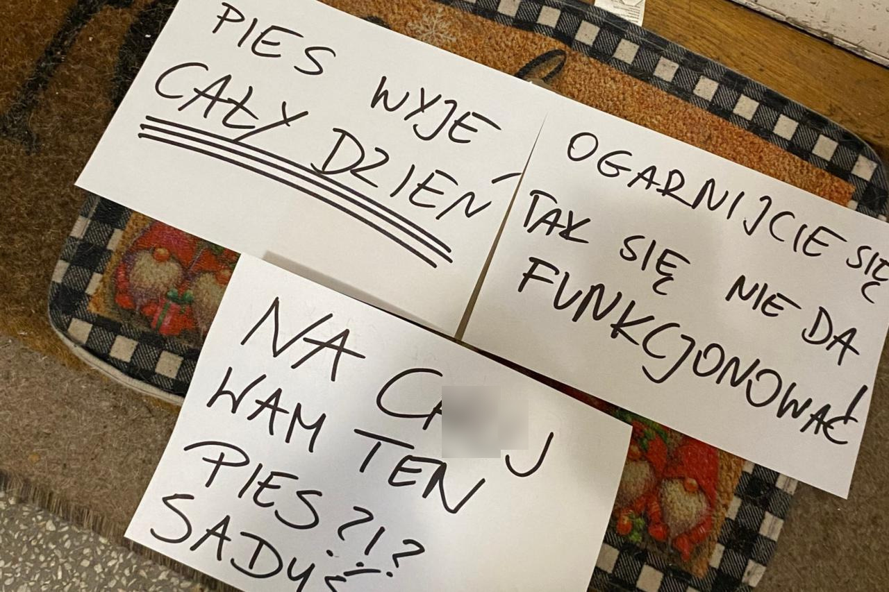 Autor wpisu zaznaczył, że sprawa była zgłaszana na policję, do Towarzystwa Opieki nad Zwierzętami czy administracji. Niestety na razie nic nie udało się tam wskórać i sytuacja wydaje się patowa. "Wszyscy o tym wiedzą i nikt nic nie zrobił. Komenda Stołeczna Policji rozkłada ręce i twierdzi, że nie ma narzędzi, może przyjąć tylko zgłoszenie. Towarzystwo twierdzi, że w takim przypadku trzeba rozmawiać z administracją. Administracja spycha problem (...). Jesteśmy totalnie bezradni, dlatego piszemy o tej sprawie publicznie, na forum. Może macie jakieś pomysły, co zrobić w takiej sytuacji? Do kogo zgłosić się o pomoc, może są fundacje, o których nie słyszeliśmy? A jeśli chcecie zrobić pikietę pod klatką, to też zapraszamy. Chodzi przede wszystkim o to biedne, umęczone zwierzę" - napisał pan Mateusz i załączył zdjęcia kartek, które właściciele psa znaleźli na wycieraczce.