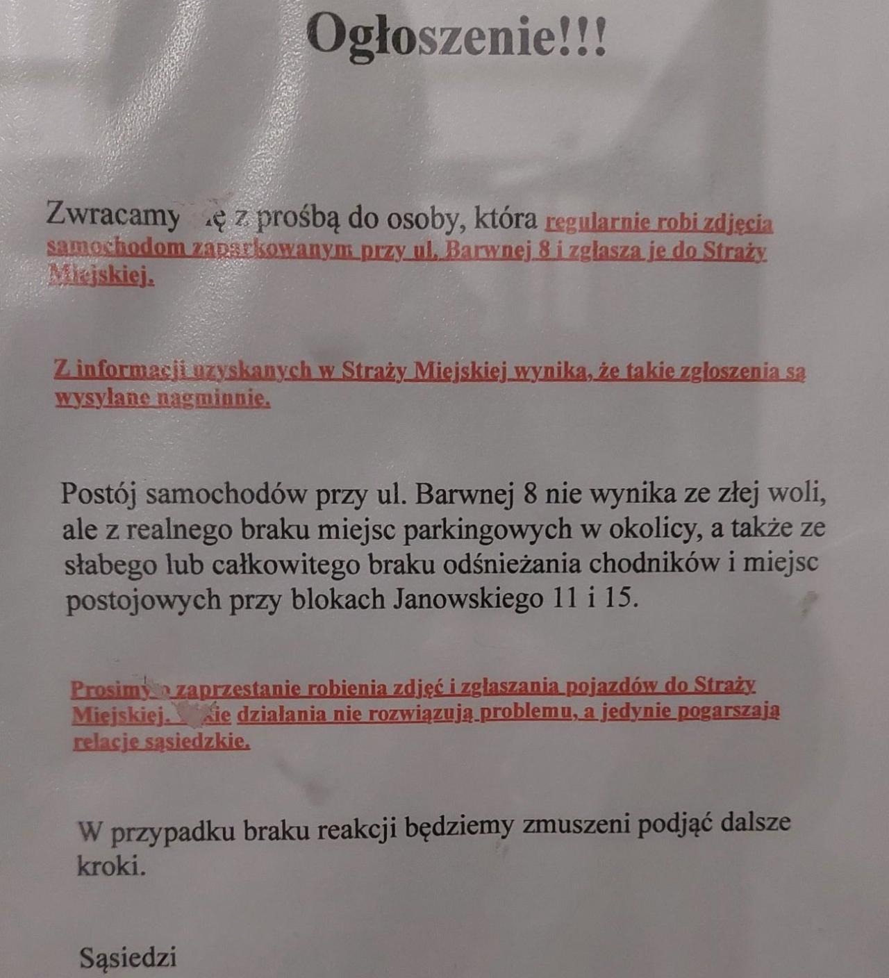 - Zwracamy się z prośbą do osoby, która regularnie robi zdjęcia samochodom zaparkowanym przy ul. Barwnej 8 i zgłasza je do Straży Miejskiej. Z informacji uzyskanych w Straży Miejskiej wynika, że takie zgłoszenia są wysyłane nagminnie. Postój samochodów przy ul. Barwnej 8 nie wynika ze złej woli, ale z realnego braku miejsc parkingowych w okolicy, a także ze słabego lub całkowitego braku odśnieżania chodników i miejsc postojowych przy blokach Janowskiego 11 i 15. Prosimy o zaprzestanie robienia zdjęć i zgłaszania pojazdów do Straży Miejskiej - takie działania nie rozwiązują problemu, a jedynie pogarszają relacje sąsiedzkie. W przypadku braku reakcji będziemy zmuszeni podjąć dalsze kroki. Sąsiedzi - czytamy.