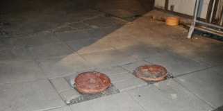 Z chodnika wystają dwa dekielki rur. W ciemnościach ich nie widać. Mieszkaniec Ochoty ostrzegł sąsiadów