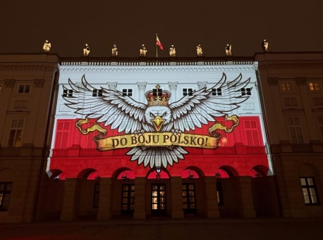 Pałac Prezydencki Prezydencki wyświetla oprawę przed meczem Polska-Malta, którą kilka dni temu zabroniono wnieść na Stadion Narodowy