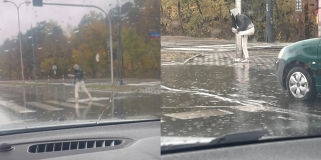 Bielany. Na przejściu dla pieszych zebrało się tyle wody, że zdjęła buty, by przejść na drugą stronę ulicy